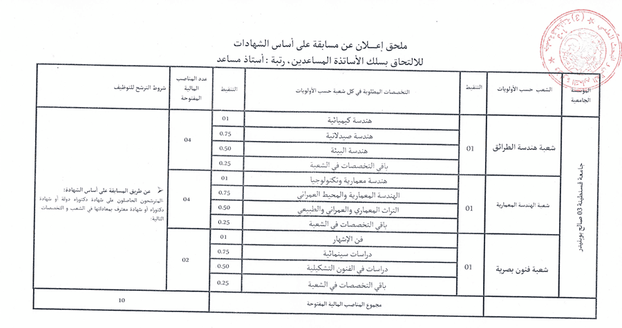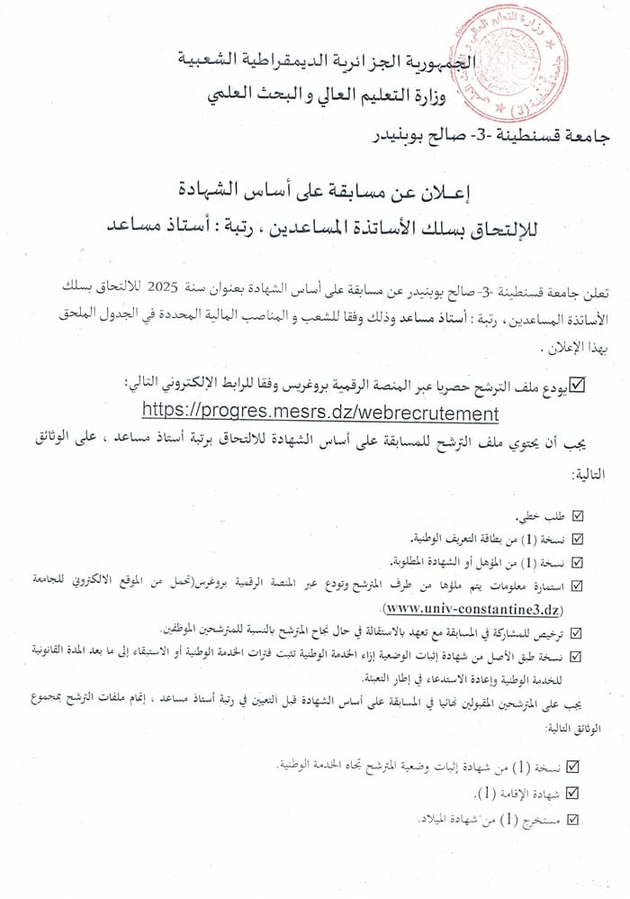 إعلان عن مسابقة على أساس الشهادة للإلتحاق بسلك الأساتذة المساعدين، رتبة: أستاذ مساعد Post Views: 718 24 ديسمبر 2025 |